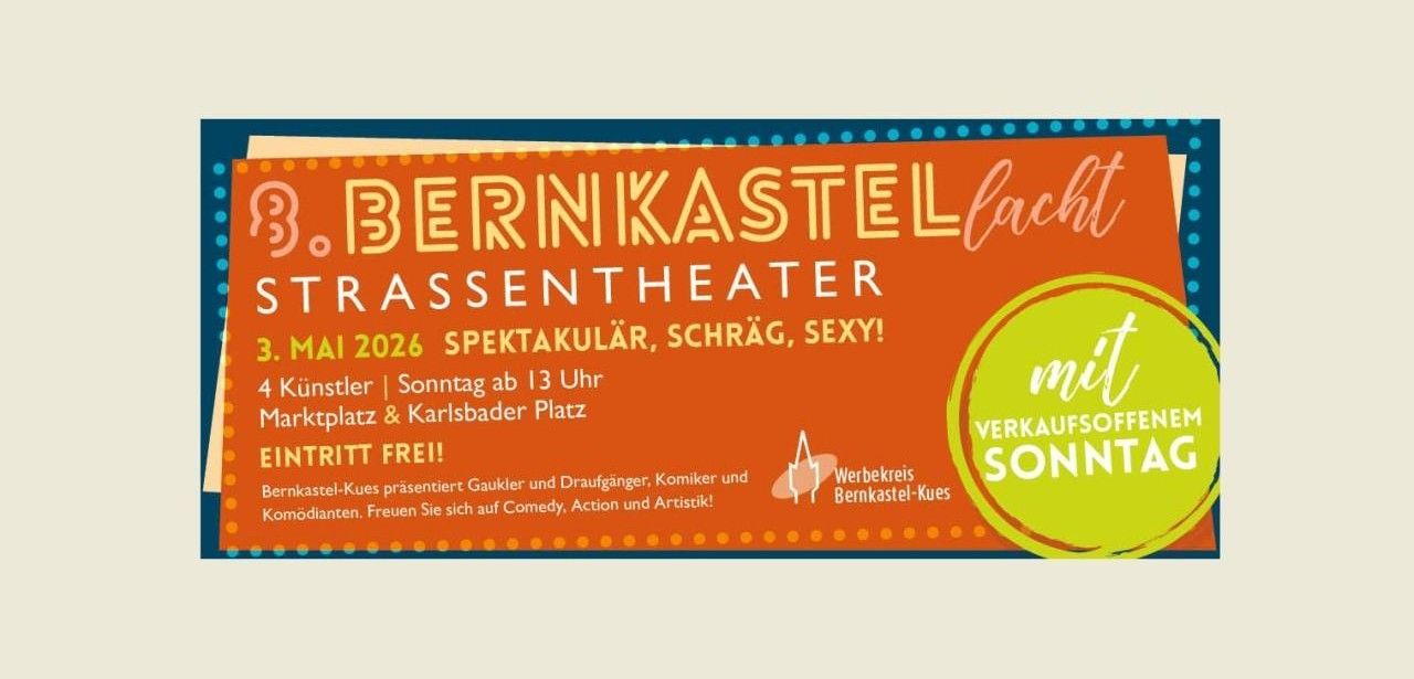 Am 3. Mai 2026 führt der Werbekreis Bernkastel-Kues e.V. erstmals verkaufsoffenen Sonntag und Straßentheater „Bernkastel lacht“ zusammen. Ab 13 Uhr öffnen Geschäfte entlang verwinkelter Gassen, präsentieren exklusive Angebote und regionale Handwerksprodukte. Gleichzeitig treten Straßenkünstler an verschiedenen Plätzen auf, bieten Comedy, Musik und artistische Darbietungen. Das Event richtet sich an alle Altersgruppen, fördert die lokale Wirtschaft und schafft Begegnungsräume, in denen Kultur und Handel in lebendiger Symbiose verschmelzen und begeistern Besucher.